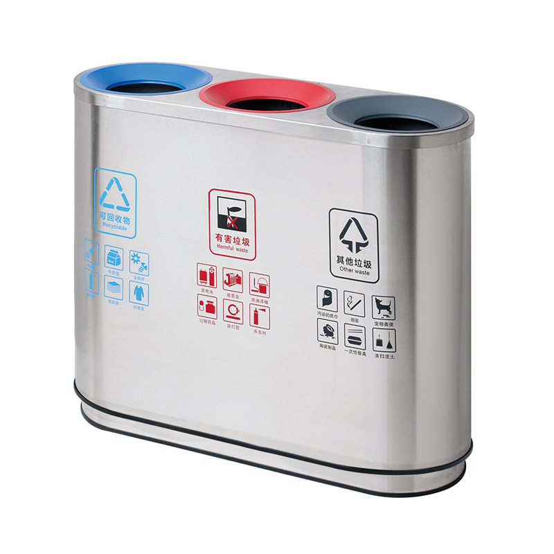 Thùng rác inox 3 ngăn là sản phẩm thông dụng trong các khu sân bay, trung tâm thương mại. Dùng để phân loại rác thải thành từng nhóm, tiện cho việc sử lý rác sau này.