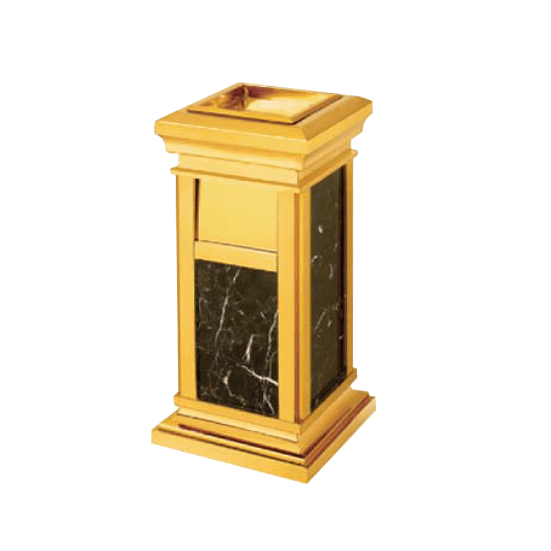Thùng rác inox đá hoa cương A15 được làm bằng chất liệu khung inox màu vàng sáng cao cấp, sang trọng. Bốn mặt xung quanh thùng rác đá hoa cương được ốp đá hoa cương màu đen chắc chắn và đẹp mắt mang đến cảm giác sạch sẽ, phù hợp với mọi khu vực, từ đơn giản đến cầu kỳ nhất.