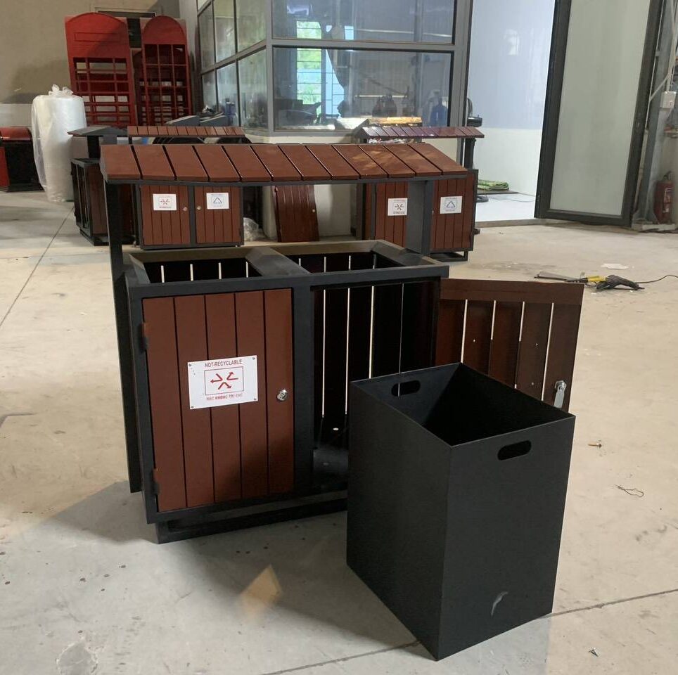 - Thép phun sơn tĩnh điện: Khung thùng rác chắc chắn, được phủ lớp sơn tĩnh điện chống gỉ sét và bong tróc, giúp sản phẩm luôn bền đẹp theo thời gian.
